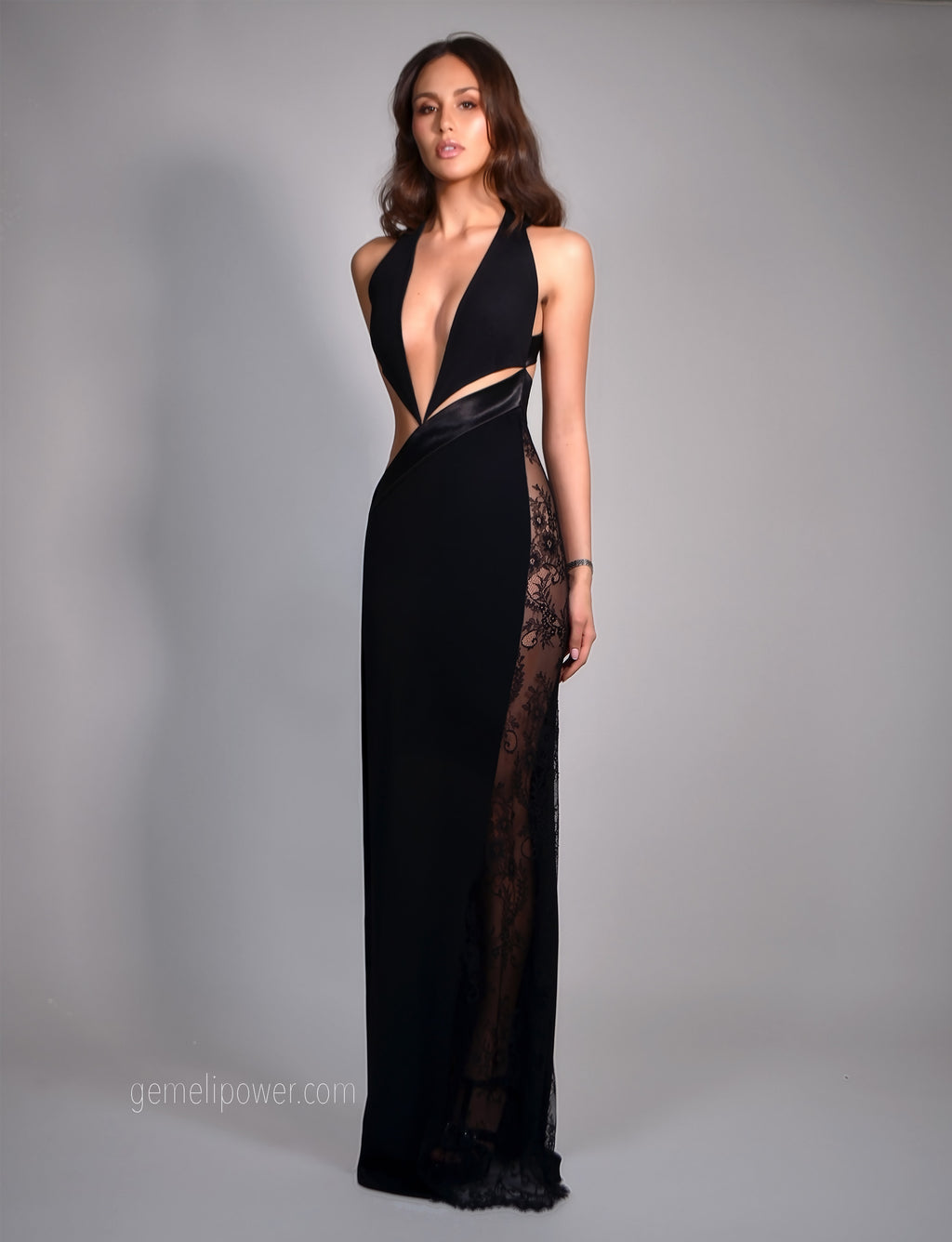 Polished angles and cut-outs define this striking, modern silhouette. A Chantilly lace side split introduces subtle drama.